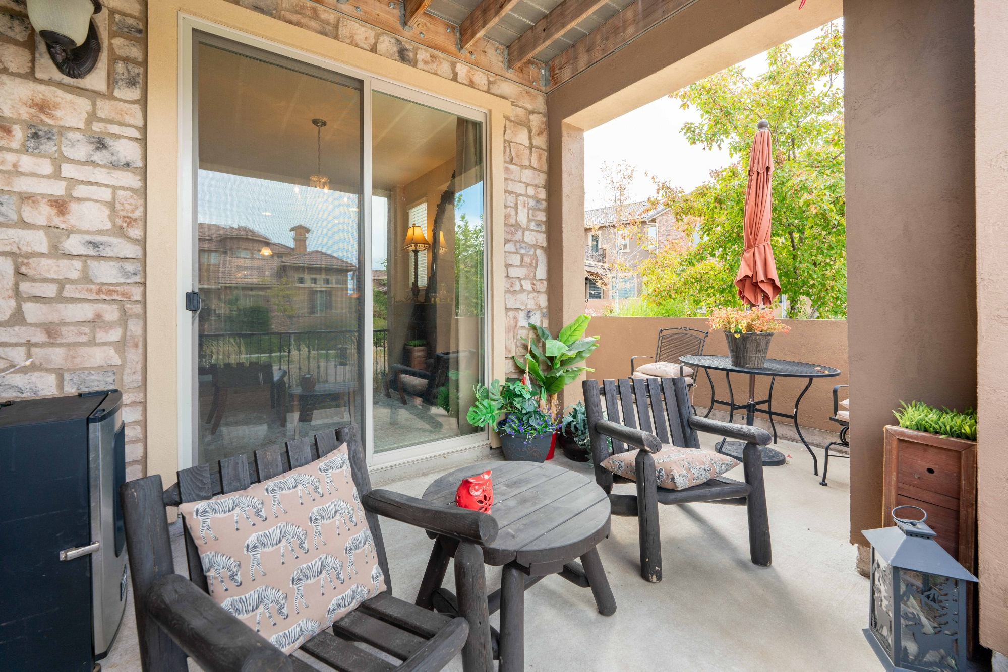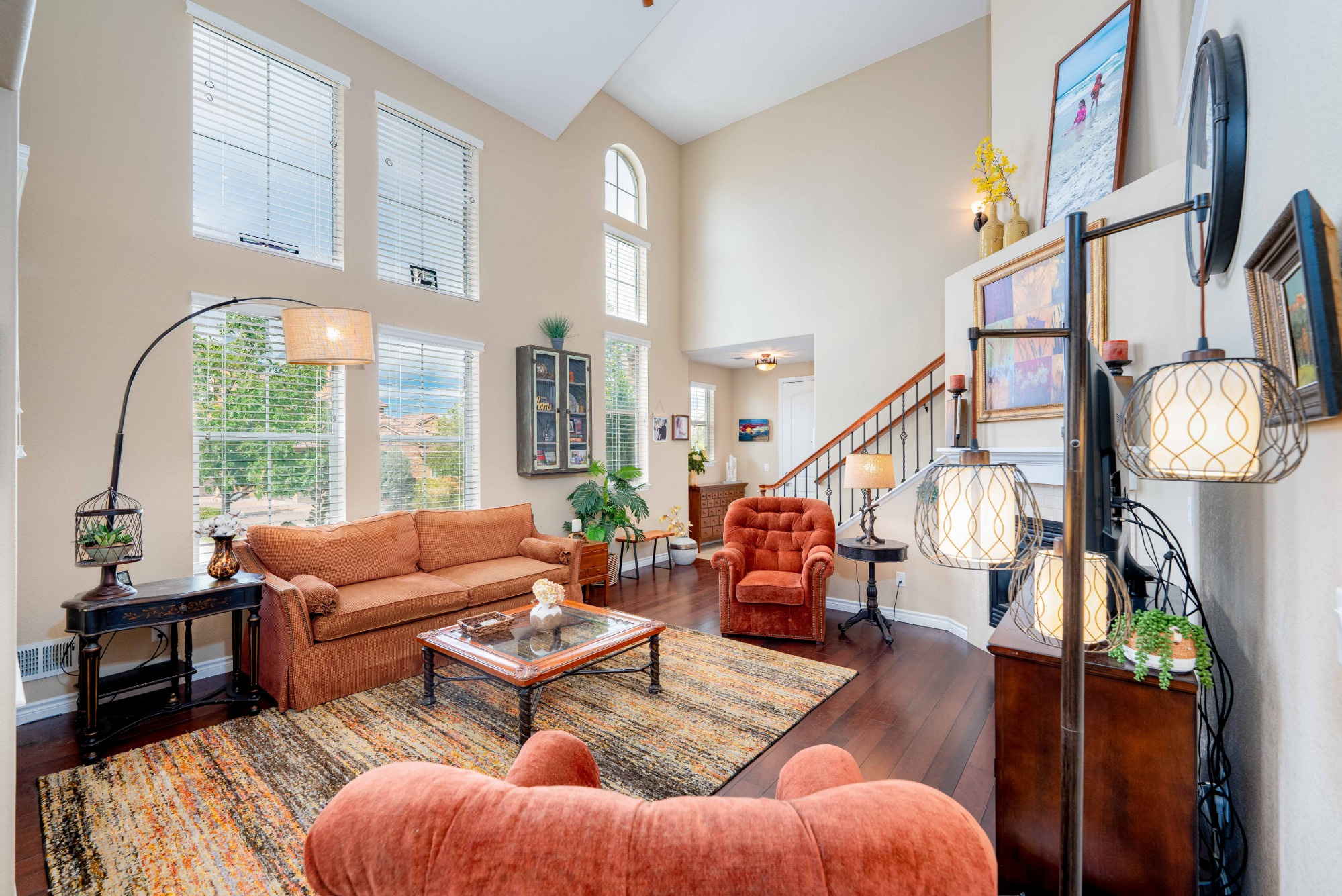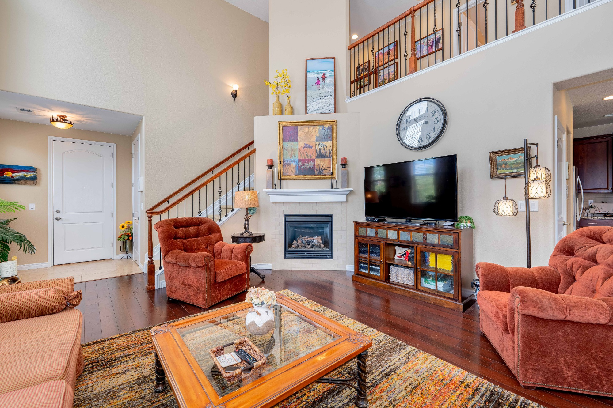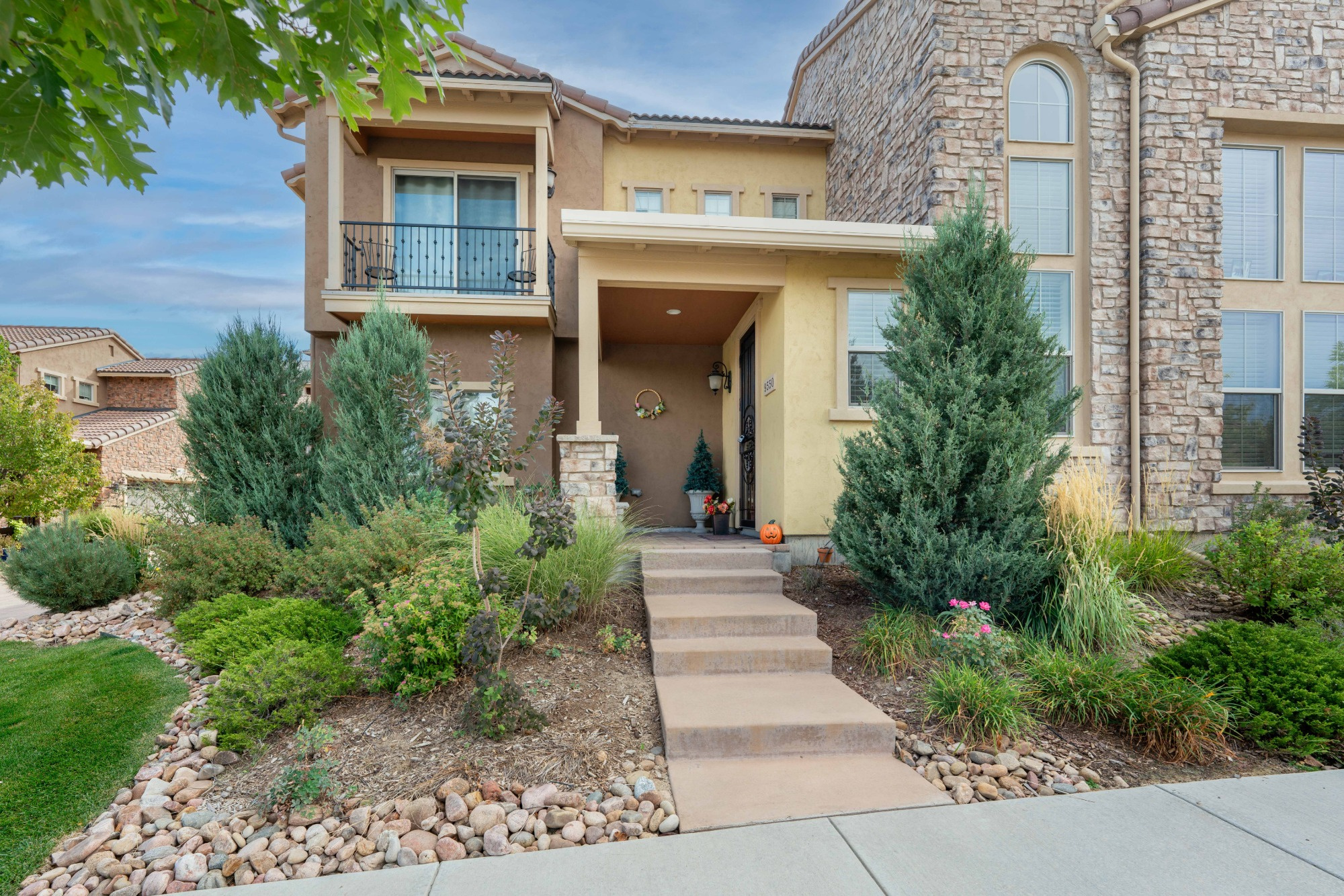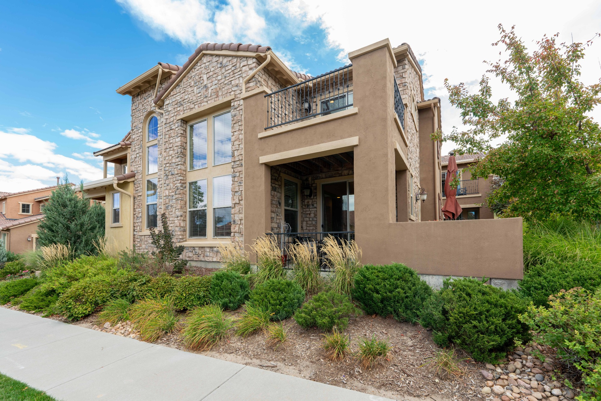 Exceptionally well designed, this Front facing townhome lives like a single family home with Windows on all 4 sides. Welcoming Front porch invites you inside to a Bright, Open Floorplan and a Spacious 2 Story Living Room boasting a Wall of Windows, a cozy Gas Fireplace with a Mantel and engineered Wood Flooring. The Elegant Dining room has a Slider leading out to a Large Wrap-around covered Patio that’s next to a grassy open space.