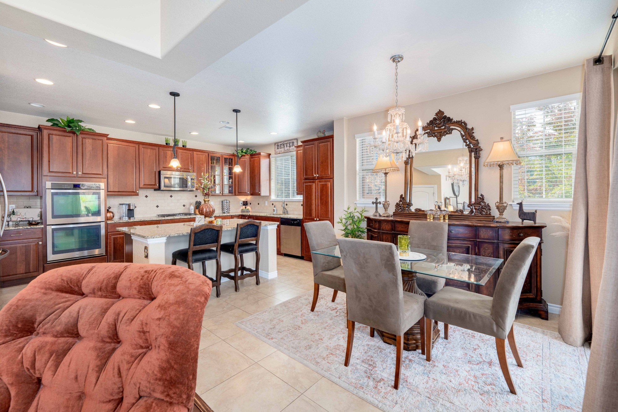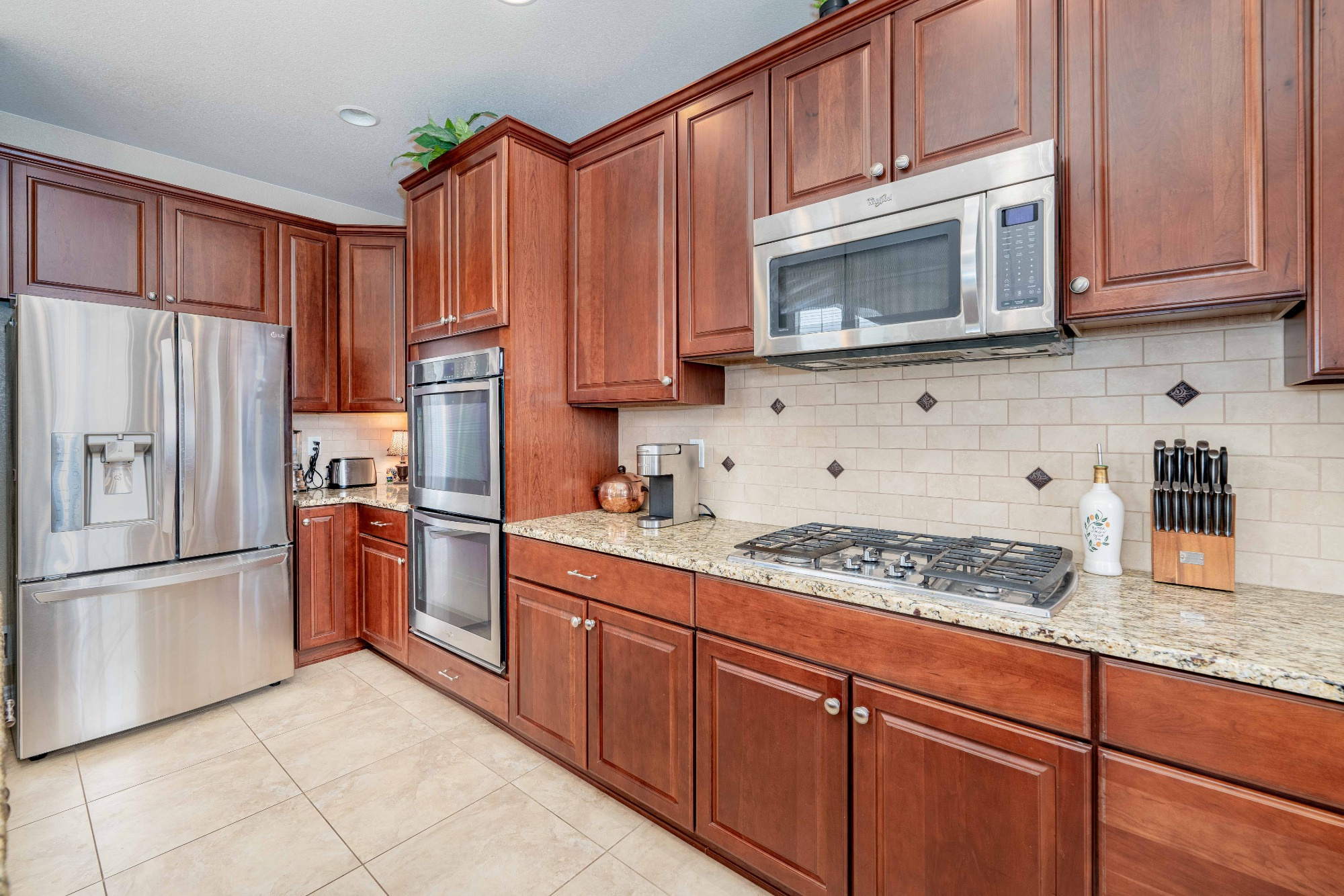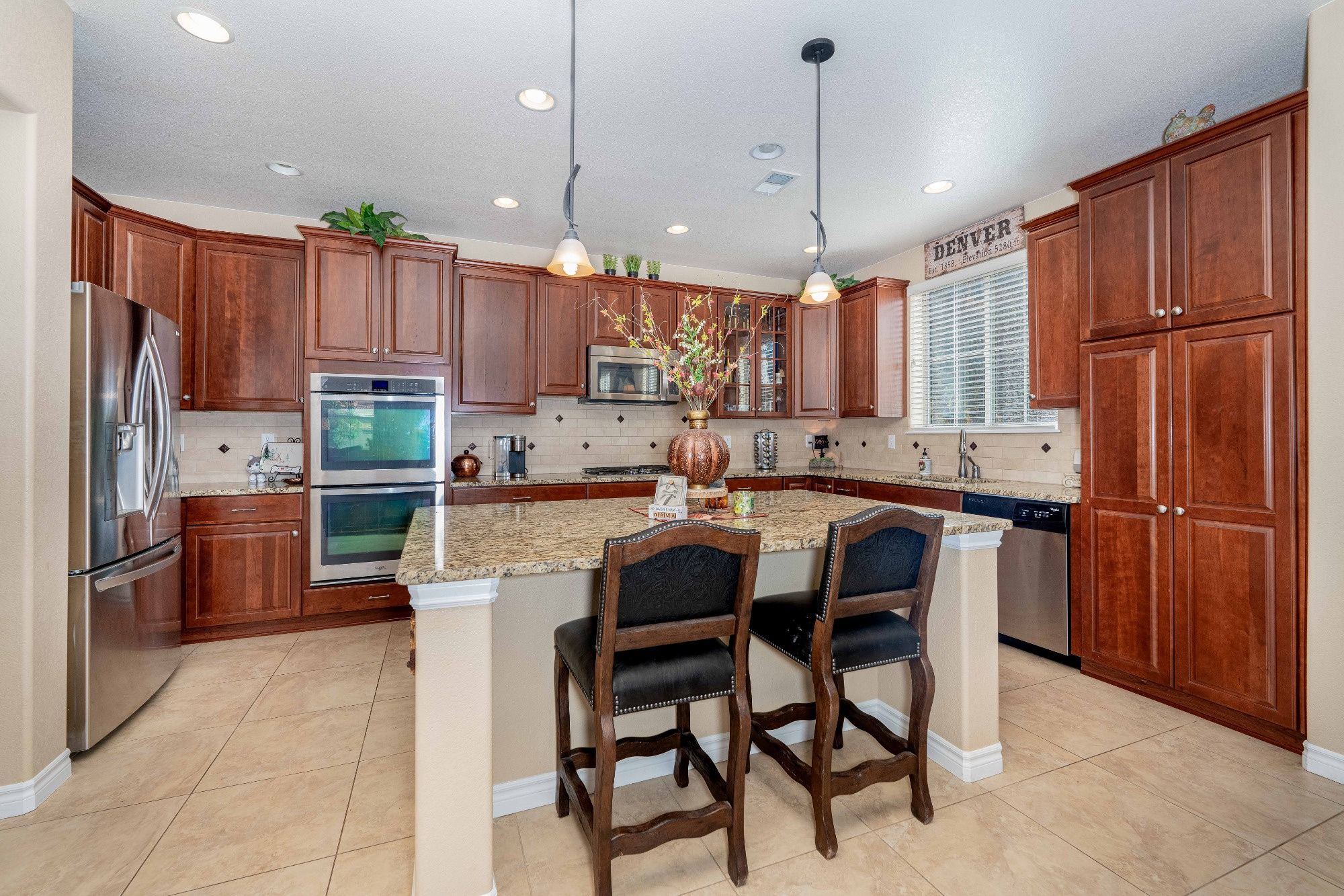 The Gourmet Kitchen is a Chef’s delight offering Slab Granite counters, Stainless Steel Appliances, includes a Gas Cooktop and Double Ovens, a Large Central Island with Breakfast Bar Seating, Pendant Lighting, plenty of Storage in the Maple Cabinetry and Large Tile Flooring.