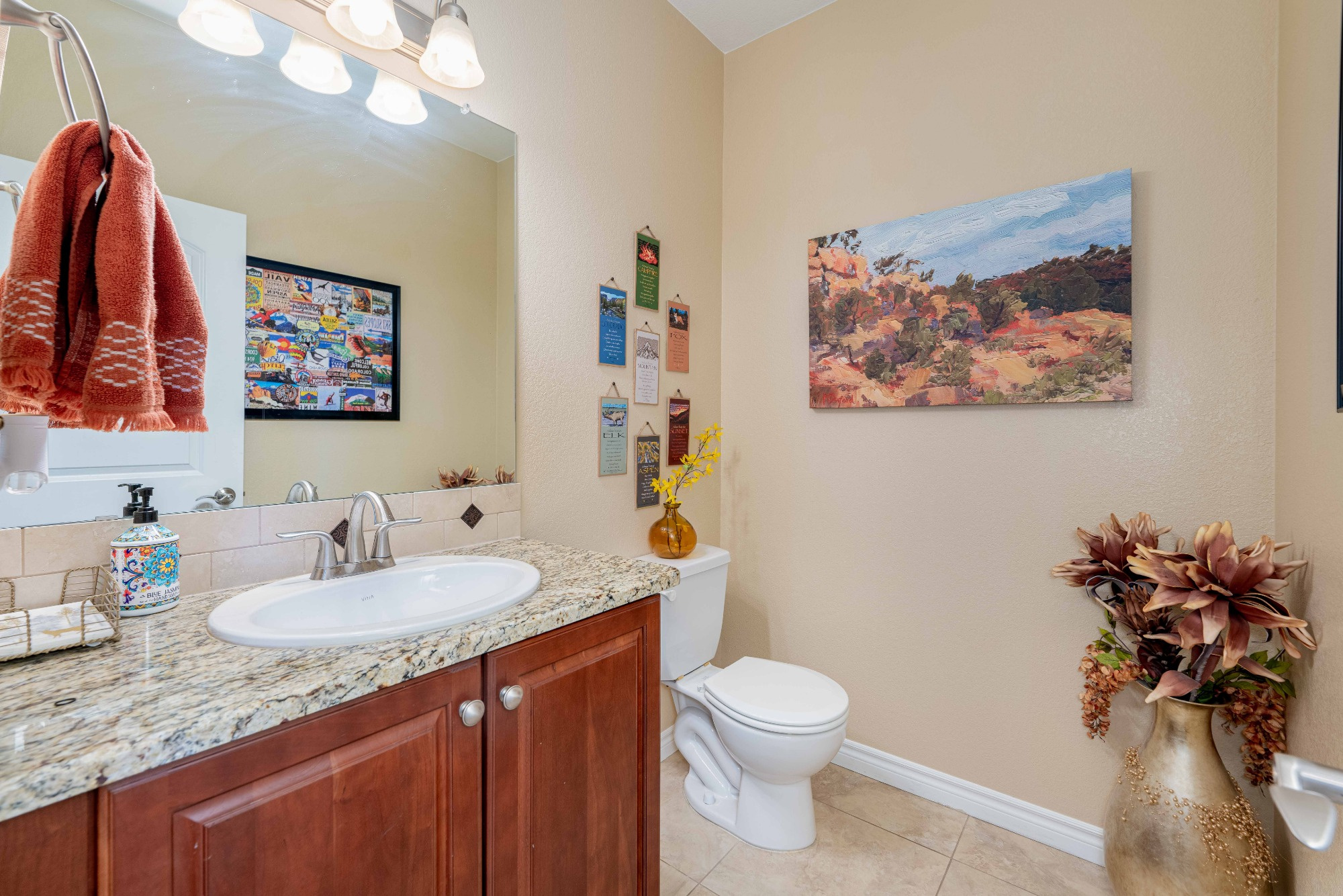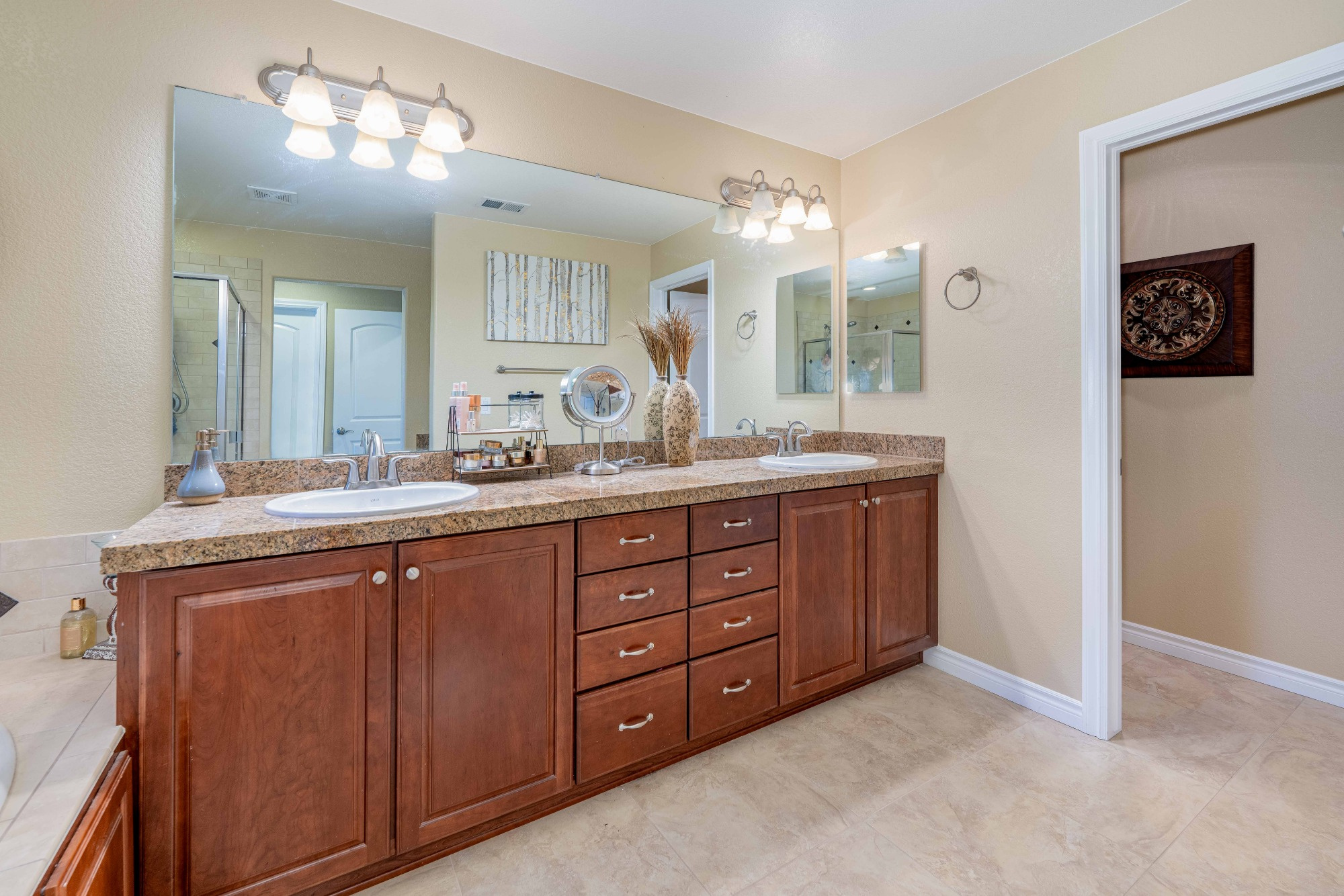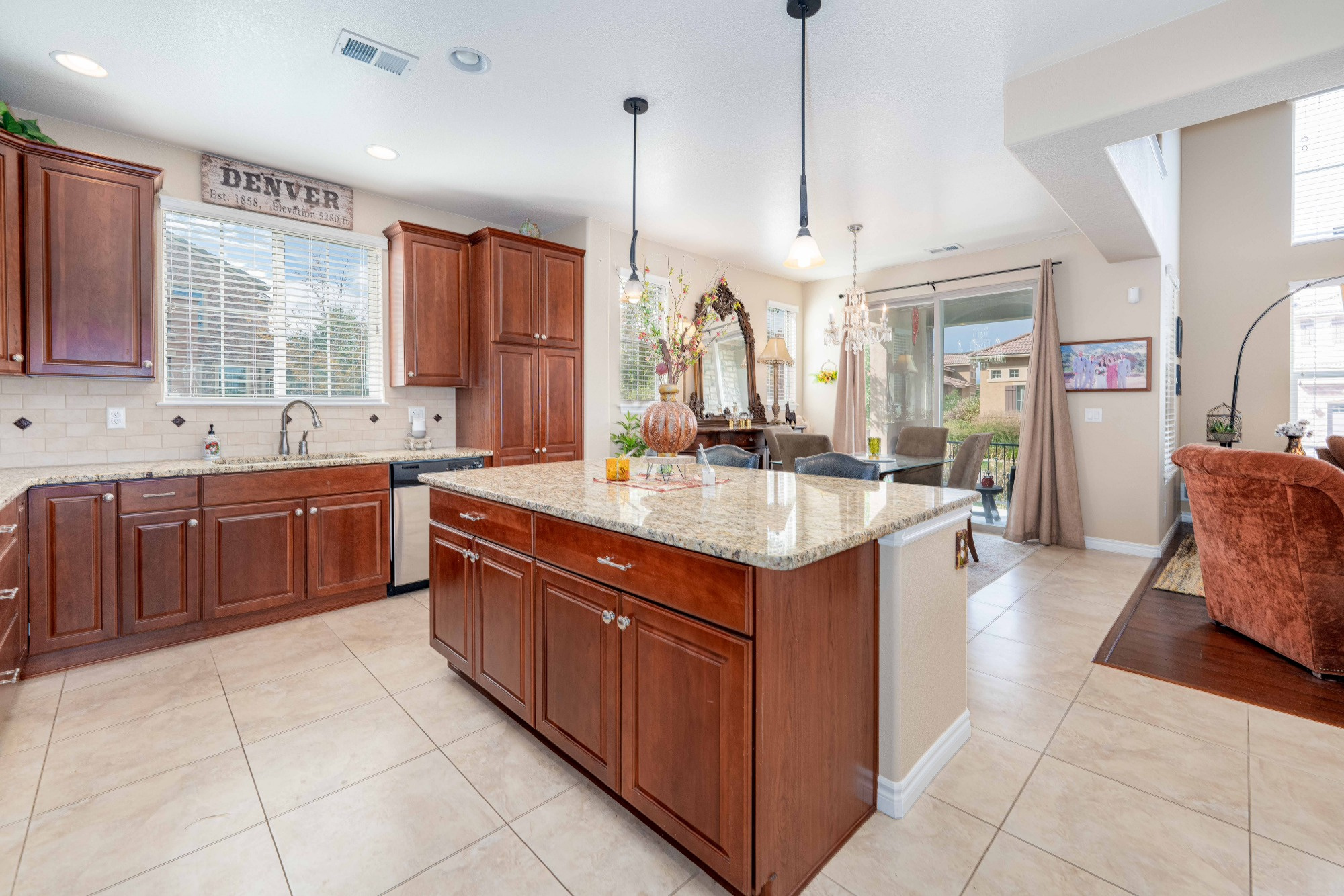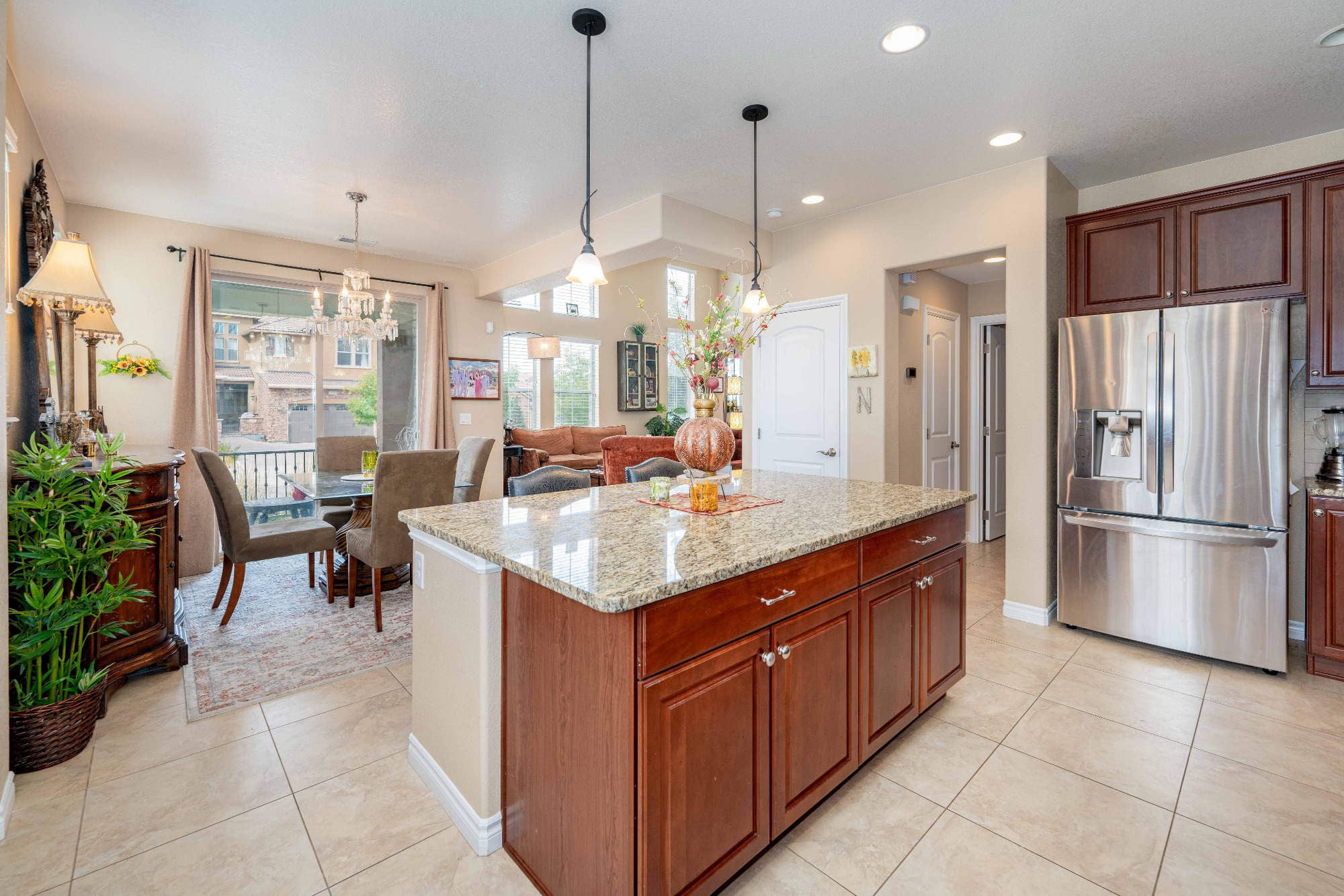 The Gourmet Kitchen is a Chef’s delight offering Slab Granite counters, Stainless Steel Appliances, includes a Gas Cooktop and Double Ovens, a Large Central Island with Breakfast Bar Seating, Pendant Lighting, plenty of Storage in the Maple Cabinetry and Large Tile Flooring.