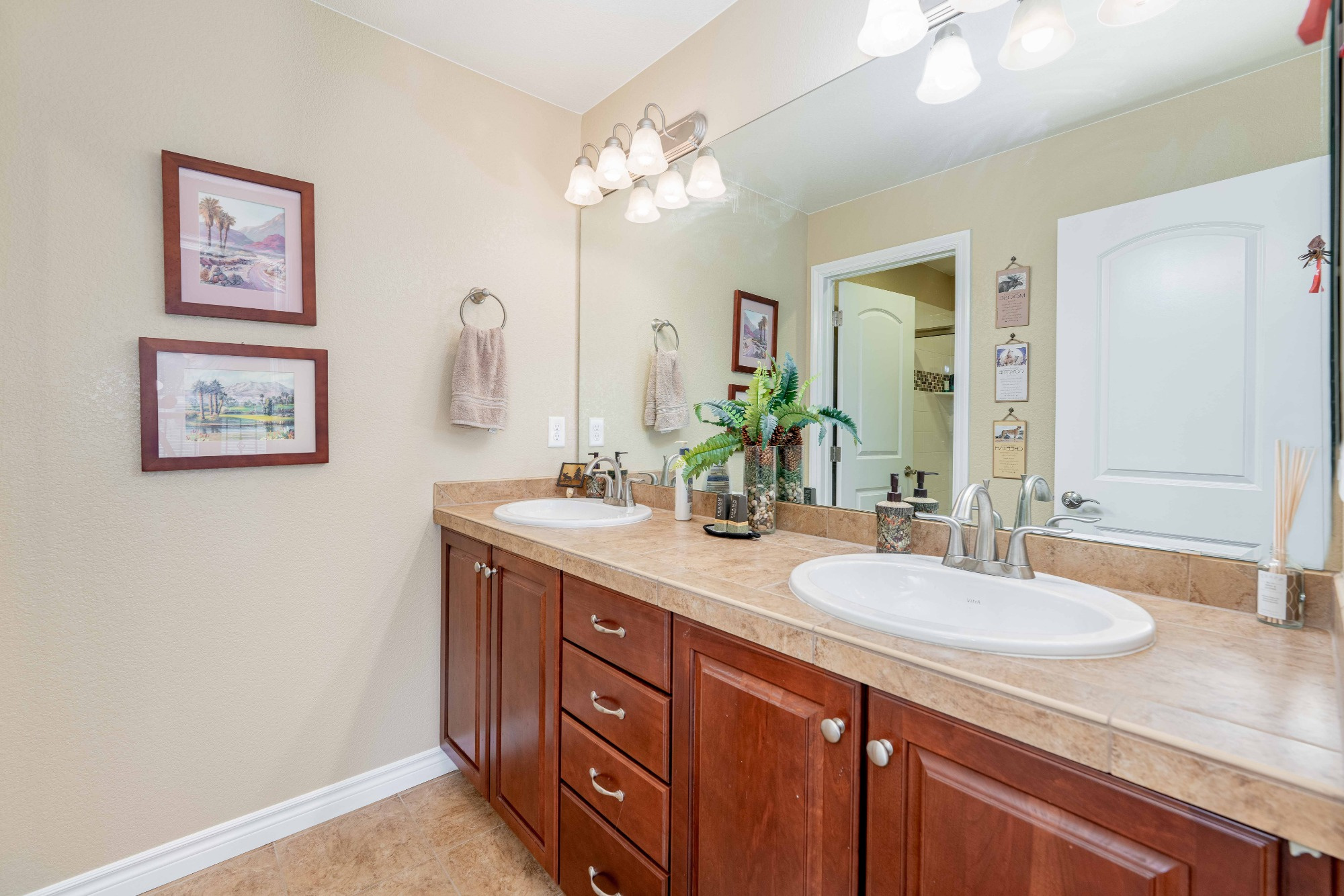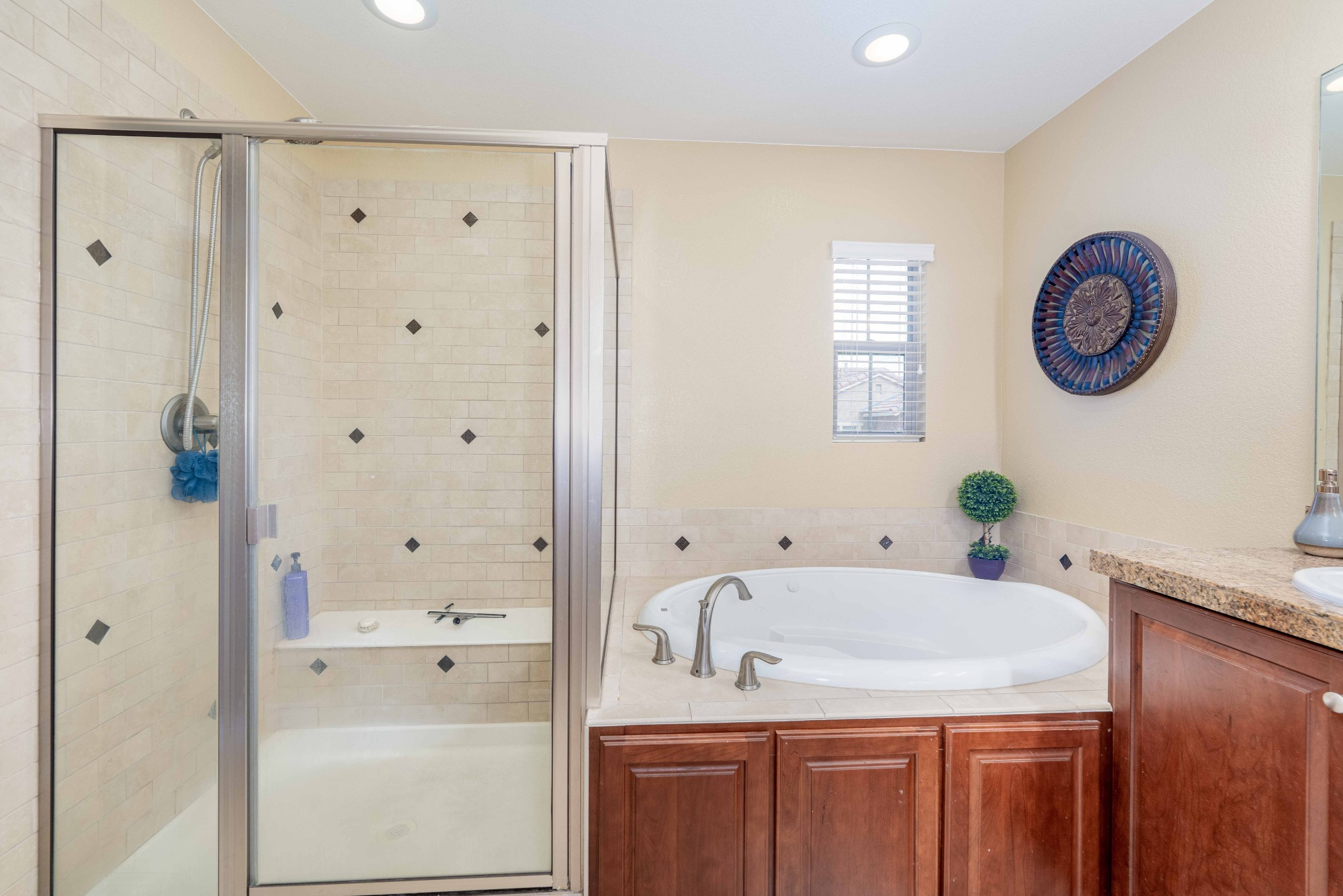 Luxurious 5-piece Primary Bath is finished with a Jetted Soaking Tub, Shower with Bench seating, Solid Granite Counters and a Generous sized Walk-in Closet. The upper level has a Secondary Bedroom and a 3/4 bath with Double Sinks, Granite Counters. Both are down the hall adding a nice separation from the Primary Bedroom.